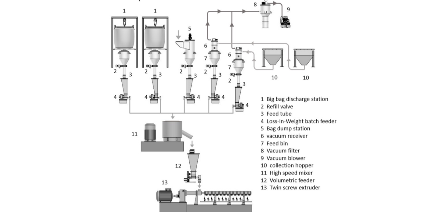 At present, the production of color masterbatch, pigments and additives, and basic resin components in China are mostly achieved through manual pre mixing processes, which require manual feeding and metering. This process has a low degree of automation, poor accuracy of the formula, and significant environmental pollution. In recent years, the use of weight loss scales and separate addition processes in the production of black and white masterbatch has improved the accuracy and stability of the formula, while reducing environmental pollution.